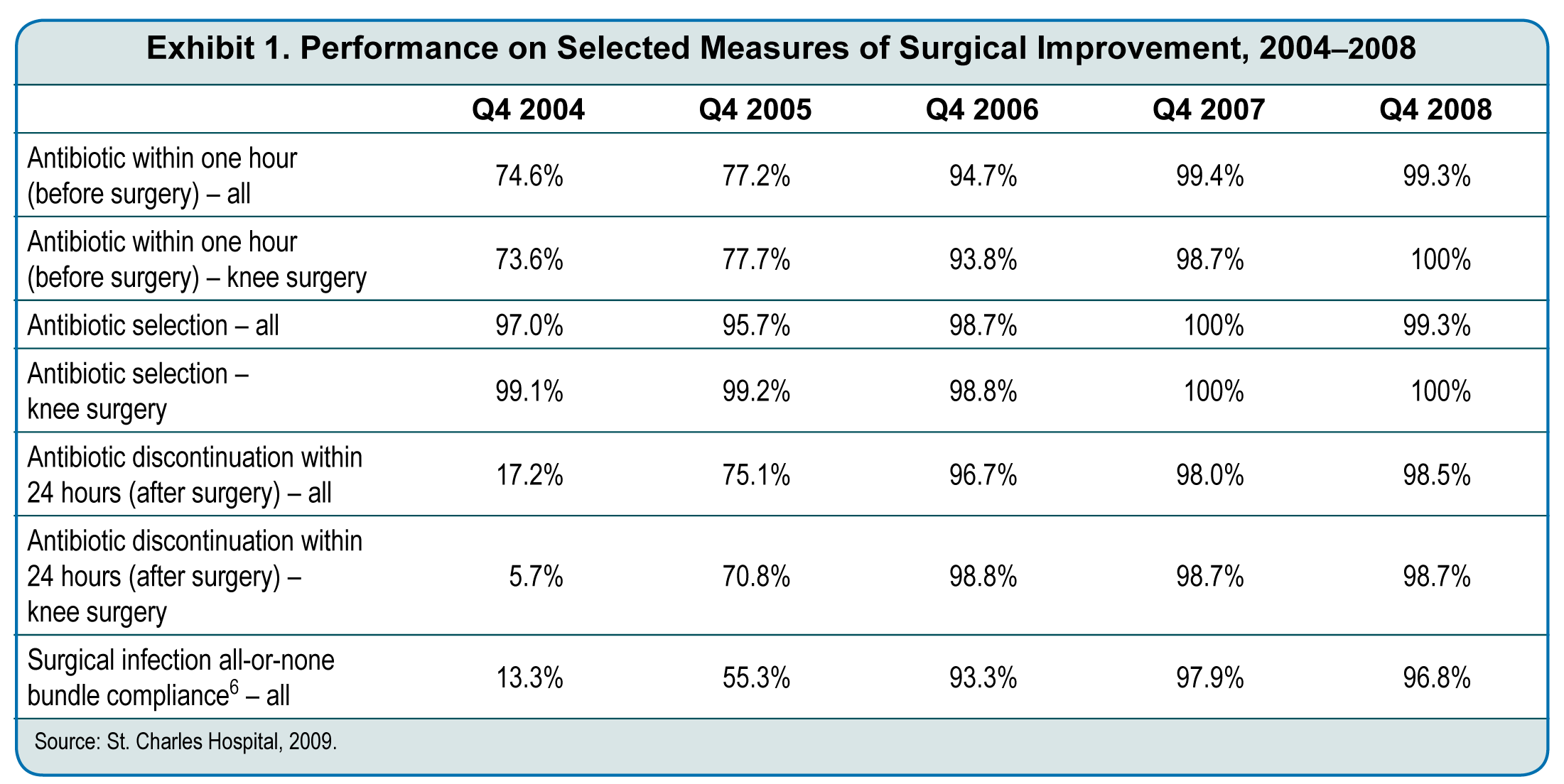 From 2004 to 2008, St Charles Hospital achieved dramatic improvement on process-of-care, or core, measures, particularly on those intended to reduce surgical complications. Conversations with administrative and clinical staff indicate that St Charles achievements in surgical care can be attributed to a hospital wide focus on quality improvement spurred by involvement in the national Surgical Care Improvement Project as well as to reliance on best-practice literature to get surgeons on board, use of preprinted order sets to standardize care processes, and a steady focus on tracking performance data and communicating results to physicians and other staff