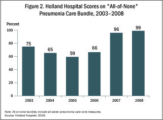 Holland Hospital has significantly improved its performance on the pneumonia process-of-care, or core measures, over the last five years. The core measures, developed by the Hospital Quality Alliance, relate to provision of recommended treatment in four clinical areas: heart attack, heart failure, pneumonia, and surgical care. Holland Hospital performs in at least the top 20 percent in all four areas, and particularly well in pneumonia and surgical care.